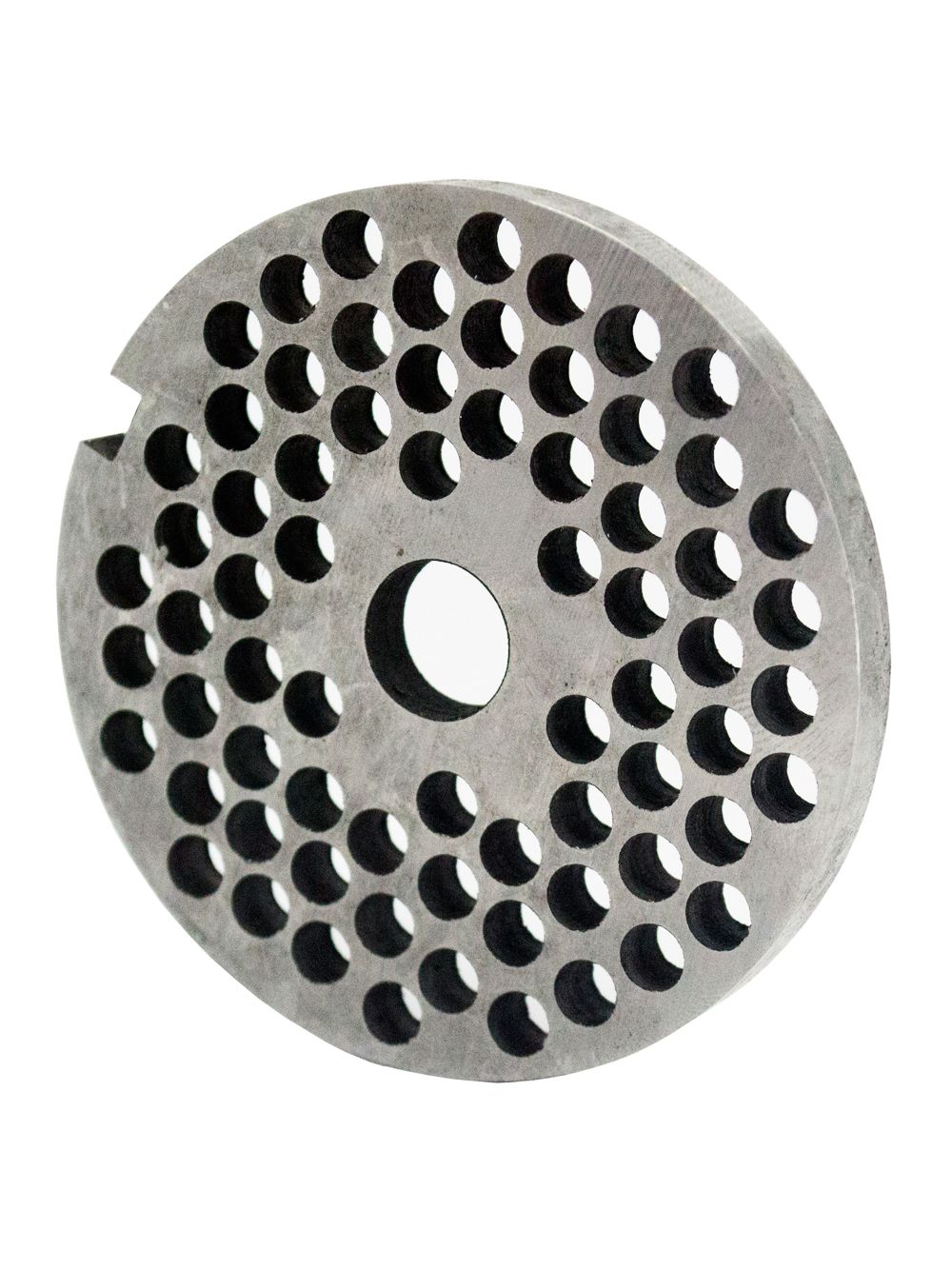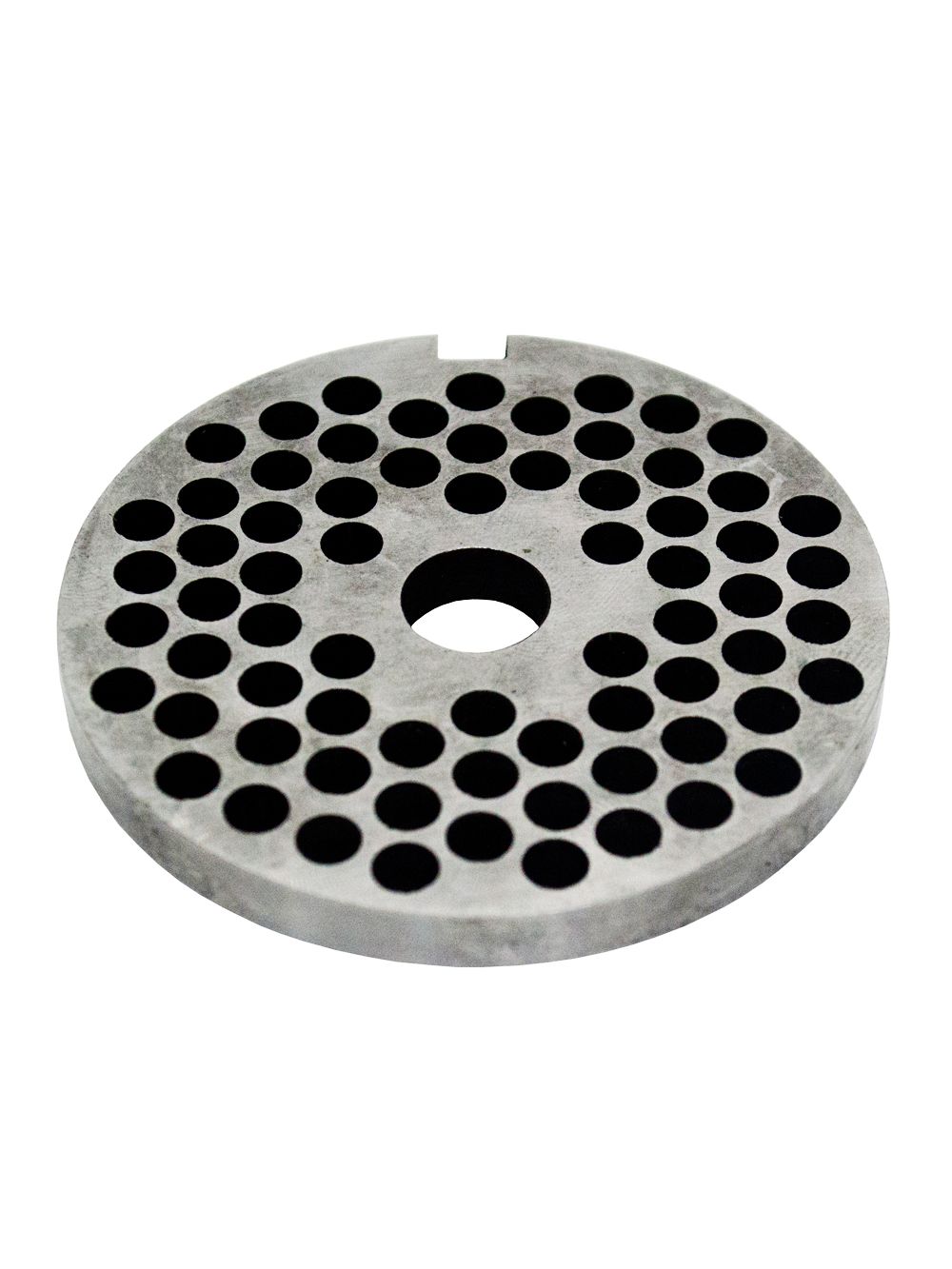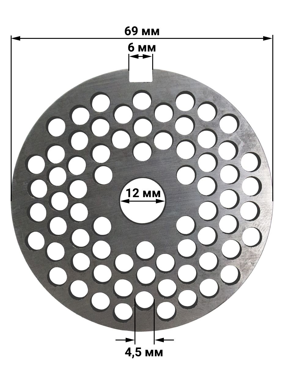 Решетка средняя №2 под нож для промышленных мясорубок МИМ-150, МИМ-150-01. Размеры: диаметр 69 мм, посадочное место 11,8 мм, рабочие отверстия 4,5 мм, отверстие под шпонку 6 мм, толщина 6,3 мм. Оригинальный код производителя - МИМ-150.01.011.