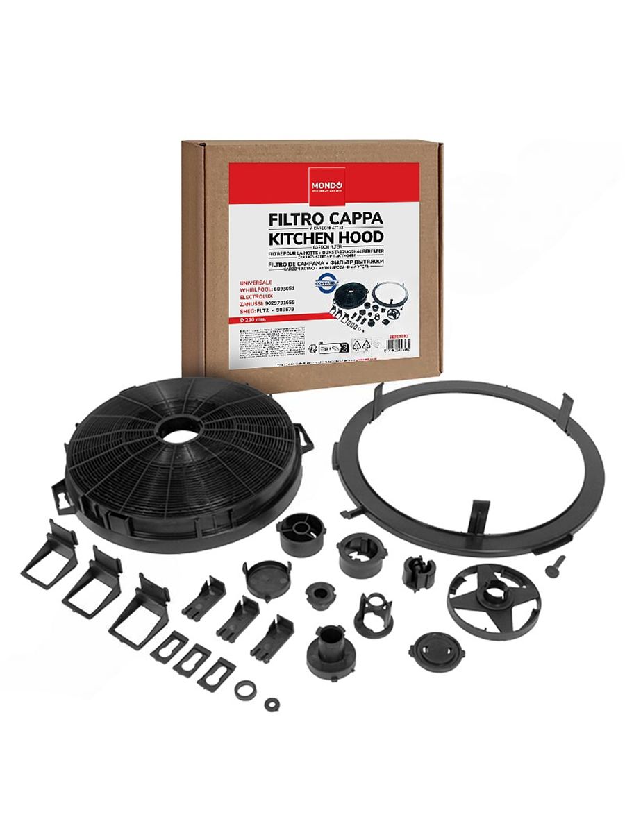 Универсальный угольный фильтр с полным крепежным набором для любого типа вытяжек. Размеры: D=210 mm, H=31 mm. Код производителя: 9029791655. Альтернативные коды: 481281728406, FLT2, 900679, 00701081.